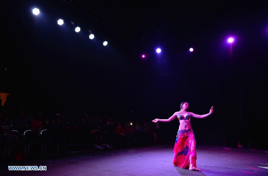 A dancer performs belly dance in Fuzhou, capital of southeast China's Fujian Province, March 22, 2015. Belly dance has become more and more popular among women in modern cities of China. (Xinhua/Wei Peiquan)