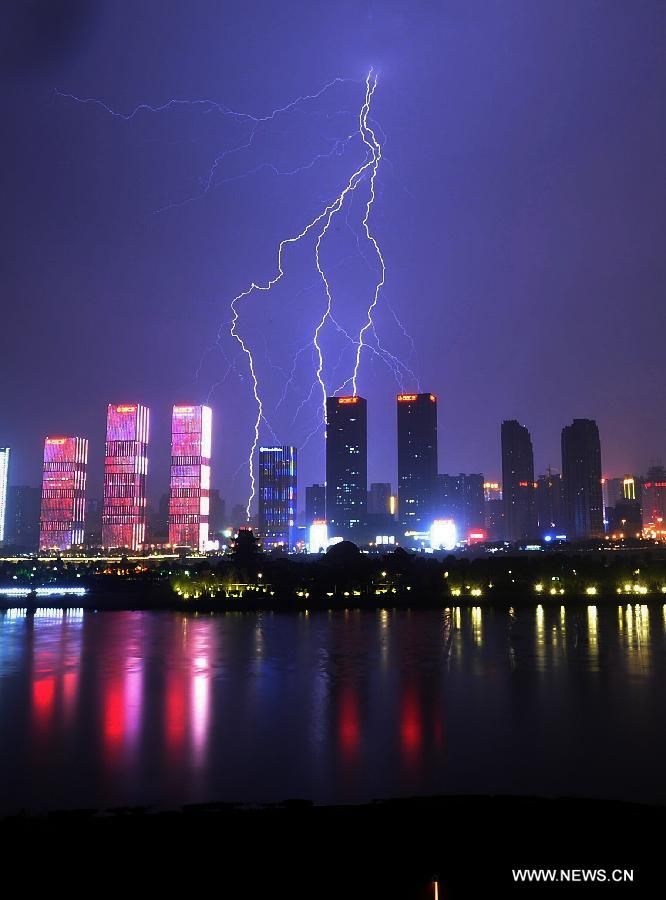 Lightning hits the sky above the urban areas along the Xiangjiang River in Changsha, capital of central China's Hunan Province, March 22, 2015. (Xinhua/Long Hongtao)