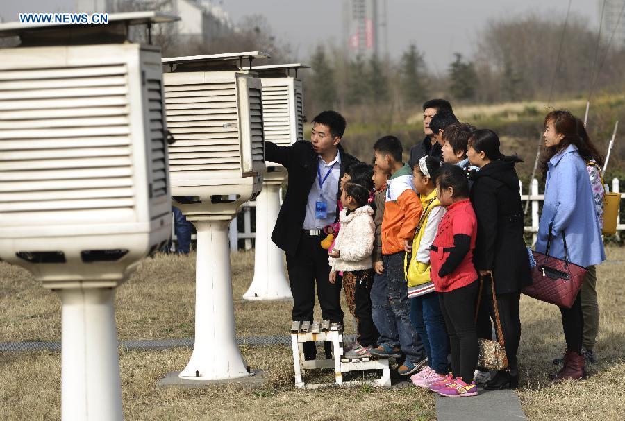 A worker of the meteorological department in Zouping County introduces to visitors the usage of instrument shelter in Zouping, east China's Shandong province, March 22, 2015. The World Meteorological Day falls on Monday this year. (Photo: Xinhua/Dong Naide)