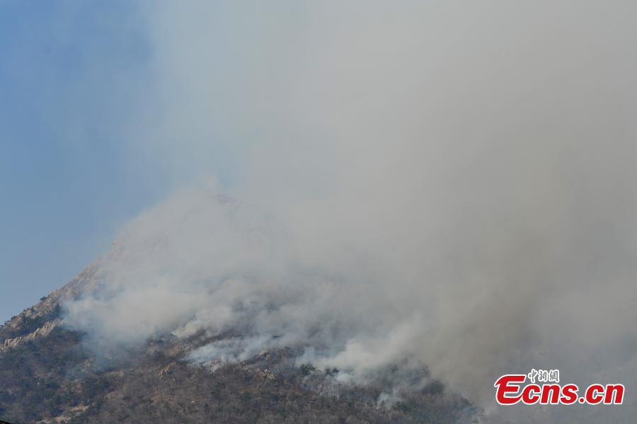 Heavy smoke rises from a fire on Dahei Mountain in Dalian, Northeast China's Liaoning province, March 22, 2015. The mountain caught fire at 2 p.m. on Sunday. (Photo: China News Service/Liu Degang)
