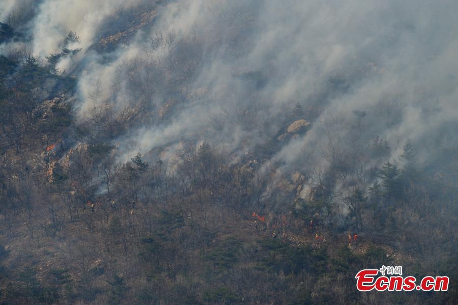 Heavy smoke rises from a fire on Dahei Mountain in Dalian, Northeast China's Liaoning province, March 22, 2015. The mountain caught fire at 2 p.m. on Sunday. (Photo: China News Service/Liu Degang)