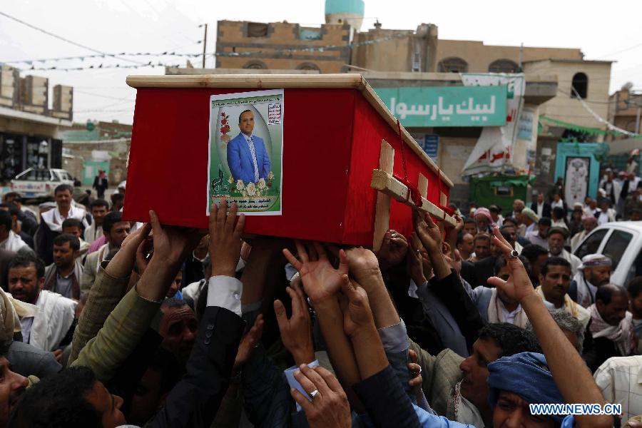| People carry a coffin during a funeral for victims in the suicide bombing attacks on mosques on Friday in Sanaa, Yemen, on March 23, 2015. The Yemeni people held a funeral for those who were killed in suicide bombing attacks in Sanaa on Friday. The Islamic State launched four bombing attacks in Yemen on Friday that killed at least 154 people and wounded 350 others. (Xinhua/Hani Ali) |