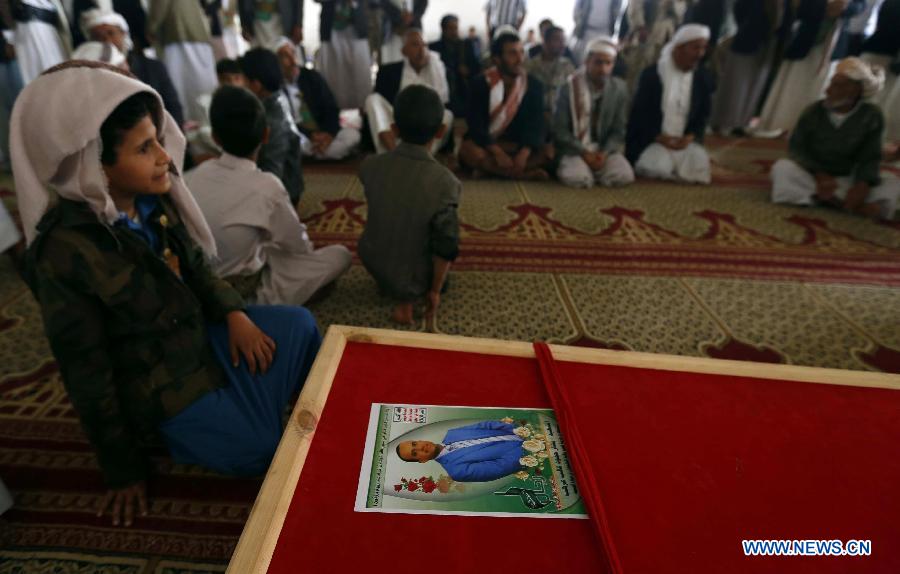 People pray for a victim in the suicide bombing attacks on mosques on Friday in Sanaa, Yemen, on March 23, 2015. The Yemeni people held a funeral for those who were killed in suicide bombing attacks in Sanaa on Friday. The Islamic State launched four bombing attacks in Yemen on Friday that killed at least 154 people and wounded 350 others. (Xinhua/Hani Ali)
