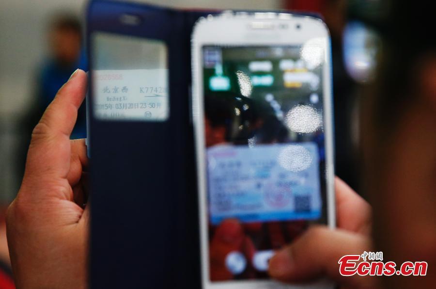 A passenger takes the picture of the train ticket before taking the underground railway line that connects Beijing’s two major railway stations, March 20, 2015. The K7742 train from Shijiazhuang in Hebei province stops at the two stations before arriving at its destination Chengde, also in Hebei province. It takes 15 minutes for the train to travel the underground section, compared with the usual 40 minutes for passengers to transfer between the two stations using other public transport. Most passengers travelling to China's north and northeast have to depart from Beijing Railway Station, while those heading for the south board their trains at Beijing West Railway Station. The completion of the direct line between the two stations also marks the connection of the Beijing-Guangzhou Railway and the Beijing-Harbin Railway, two major railway lines in China. (Photo: China News Service/Liu Guanguan)