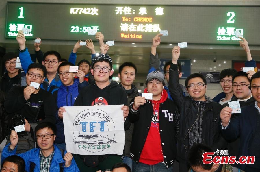 | Passengers pose for photo to celebrate the opening of an underground railway line directly connecting Beijing’s two major railway stations, March 20, 2015. The K7742 train from Shijiazhuang in Hebei province stops at the two stations before arriving at its destination Chengde, also in Hebei province. It takes 15 minutes for the train to travel the underground section, compared with the usual 40 minutes for passengers to transfer between the two stations using other public transport. Most passengers travelling to China's north and northeast have to depart from Beijing Railway Station, while those heading for the south board their trains at Beijing West Railway Station. The completion of the direct line between the two stations also marks the connection of the Beijing-Guangzhou Railway and the Beijing-Harbin Railway, two major railway lines in China. (Photo: China News Service/Liu Guanguan) |