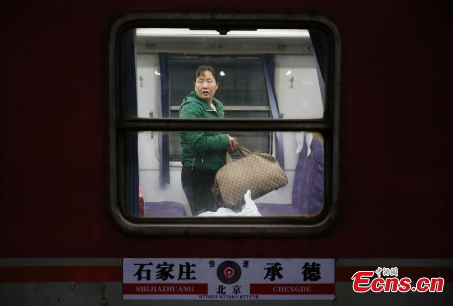 | Passengers take a train on the underground railway line connecting Beijing’s two major railway stations, March 20, 2015. The K7742 train from Shijiazhuang in Hebei province stops at the two stations before arriving at its destination Chengde, also in Hebei province. It takes 15 minutes for the train to travel the underground section, compared with the usual 40 minutes for passengers to transfer between the two stations using other public transport. Most passengers travelling to China's north and northeast have to depart from Beijing Railway Station, while those heading for the south board their trains at Beijing West Railway Station. The completion of the direct line between the two stations also marks the connection of the Beijing-Guangzhou Railway and the Beijing-Harbin Railway, two major railway lines in China. (Photo: China News Service/Liu Guanguan) |