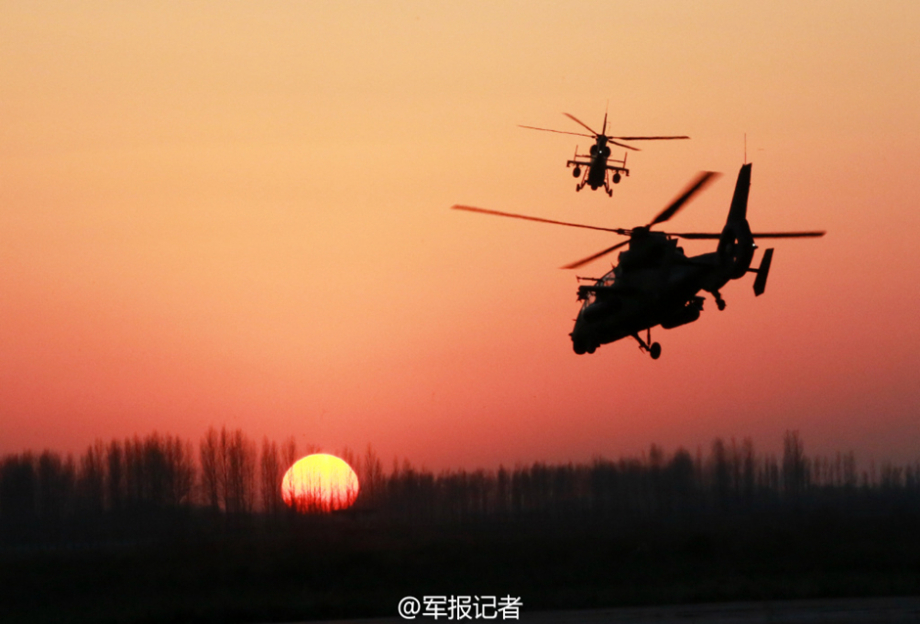 Photo shows China's WZ-19 helicopters fly in formation. Recently, the aviation brigade under PLA's Xinjiang Military Region held helicopter flight training to improve the troop's night combat capability.