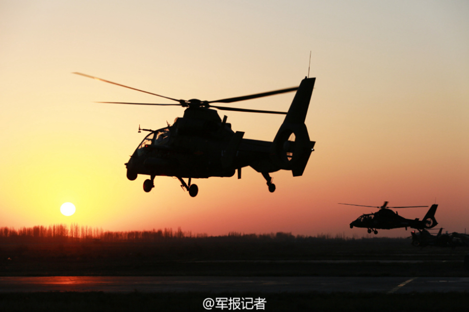 Photo shows China's WZ-19 helicopters fly in formation. Recently, the aviation brigade under PLA's Xinjiang Military Region held helicopter flight training to improve the troop's night combat capability.