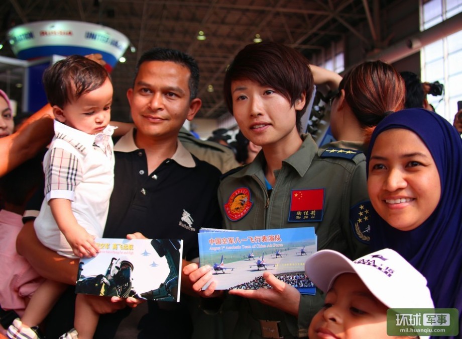 The spectators pose for photo with Chinese fighter pilot in Malaysia. (Global Times/Li Xuan)