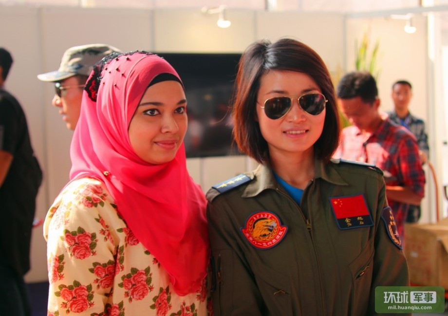 A spectator poses for photos with Chinese fighter pilot in Malaysia. (Global Times/Li Xuan)