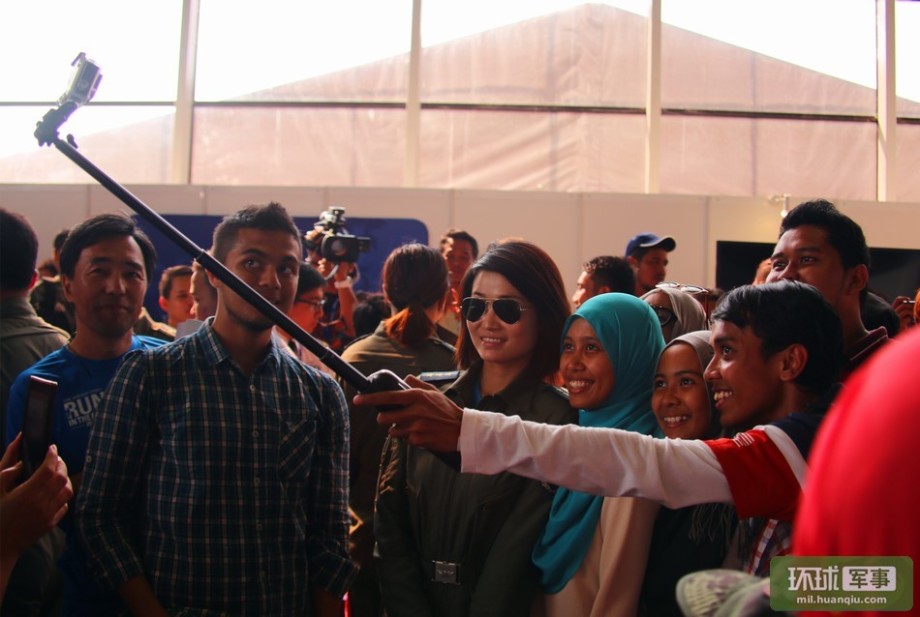 The spectators pose for photo with Chinese fighter pilot in Malaysia. (Global Times/Li Xuan)