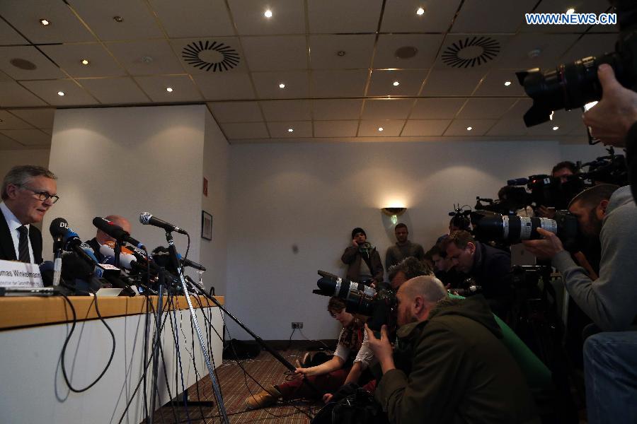 Germanwings CEO Thomas Winkelmann (1st L) speaks during the press conference over the crashed Germanwings flight 4U9525 in Cologne, Germany, on March 24, 2015. There are no Chinese passengers onboard the crashed Germanwings flight 4U9525, "as far as we know today", said Germanwings CEO Thomas Winkelmann on Tuesday. (Xinhua/Luo Huanhuan)