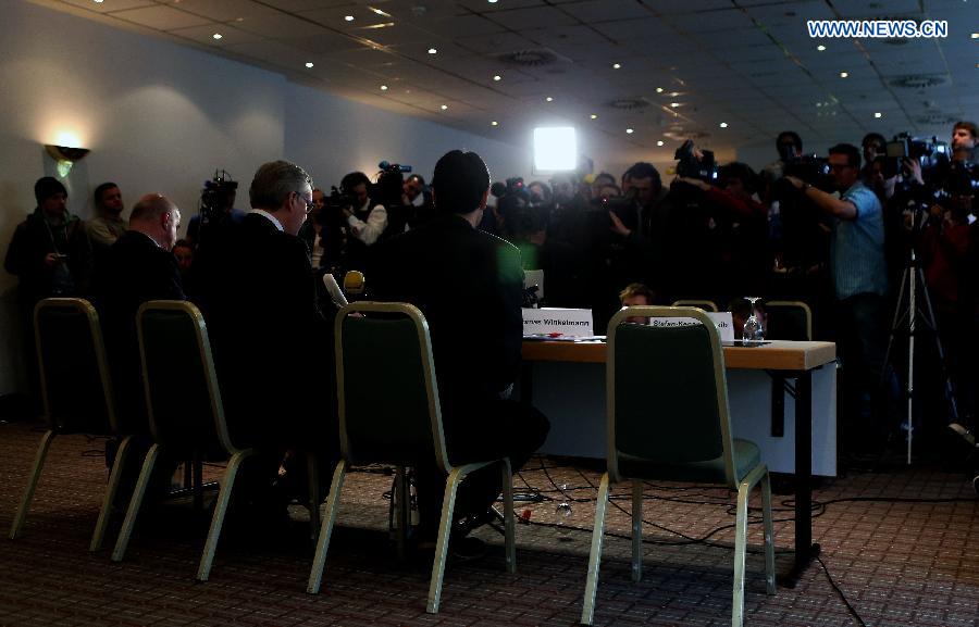 Germanwings representatives attend the press conference over the crashed Germanwings flight 4U9525 in Cologne, Germany, on March 24, 2015. There are no Chinese passengers onboard the crashed Germanwings flight 4U9525, "as far as we know today", said Germanwings CEO Thomas Winkelmann on Tuesday. (Xinhua/Luo Huanhuan)