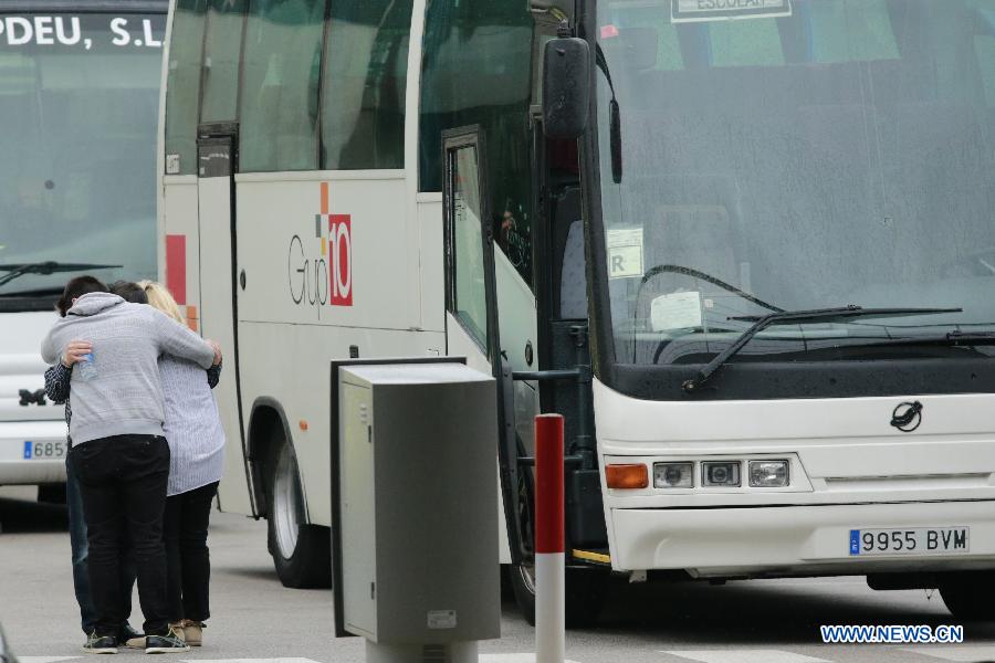 Family members of passengers in the crashed plane of Germanwings hug each other at Barcelona's El Prat airport in Barcelona, Spain, on March 24, 2015. An Airbus A320 of the German low-cost airline Germanwings with 150 people on board crashed on Tuesday in southern France, French authorities confirmed. (Xinhua/Pau Barrena)