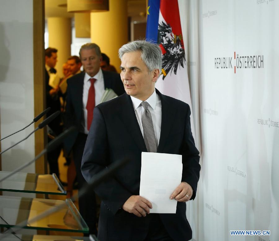 Austrian Chancellor Werner Faymann attends a press conference in Vienna, Austria, on March 24, 2015. Austria has decided to participate in the establishment of Asian Infrastructure Investment Bank (AIIB), a foreign minister spokesperson told Xinhua on Tuesday. (Xinhua/Austrian Chancellery)