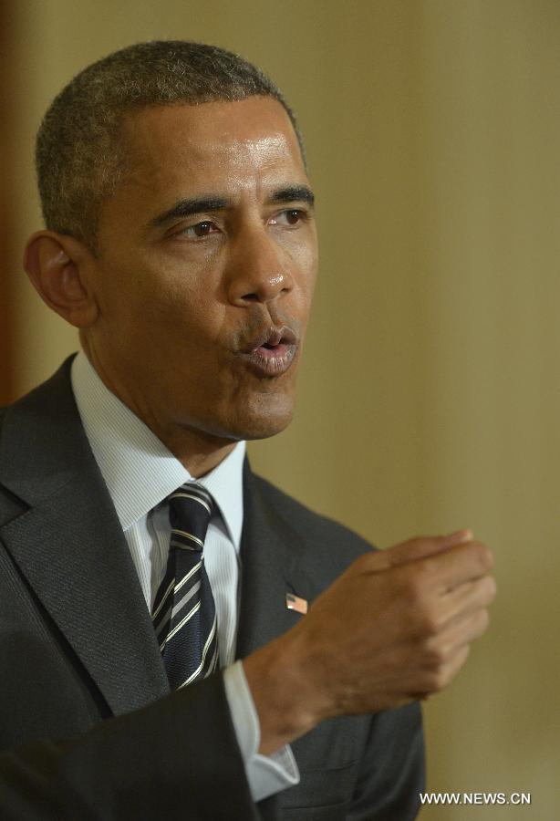 U.S. President Barack Obama speaks at a joint press conference in the East Room of White House in Washington D.C., the United States, March 24, 2015. U.S. President Barack Obama announced Tuesday no drawdown of the current 9,800 U.S. troops stationed in Afghanistan will occur through the end of 2015. (Xinhua/Yin Bogu)