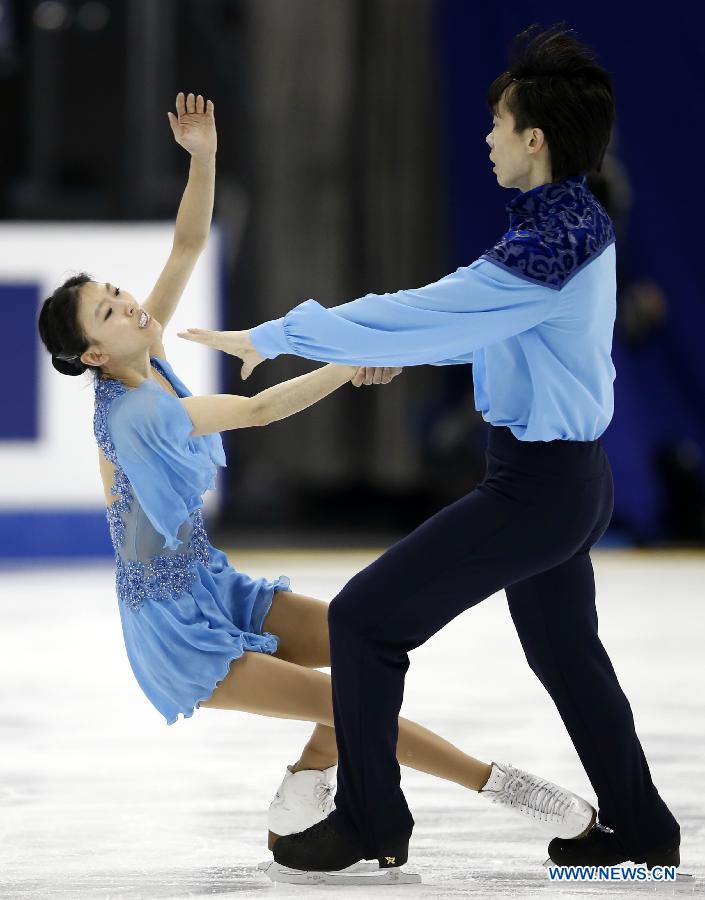 Pang Qing and Tong Jian of China take part in their training session before World Figure Skating Championships 2015 at Oriental Sports Center in Shanghai, China on March 24, 2015.(Xinhua/Wang Lili)