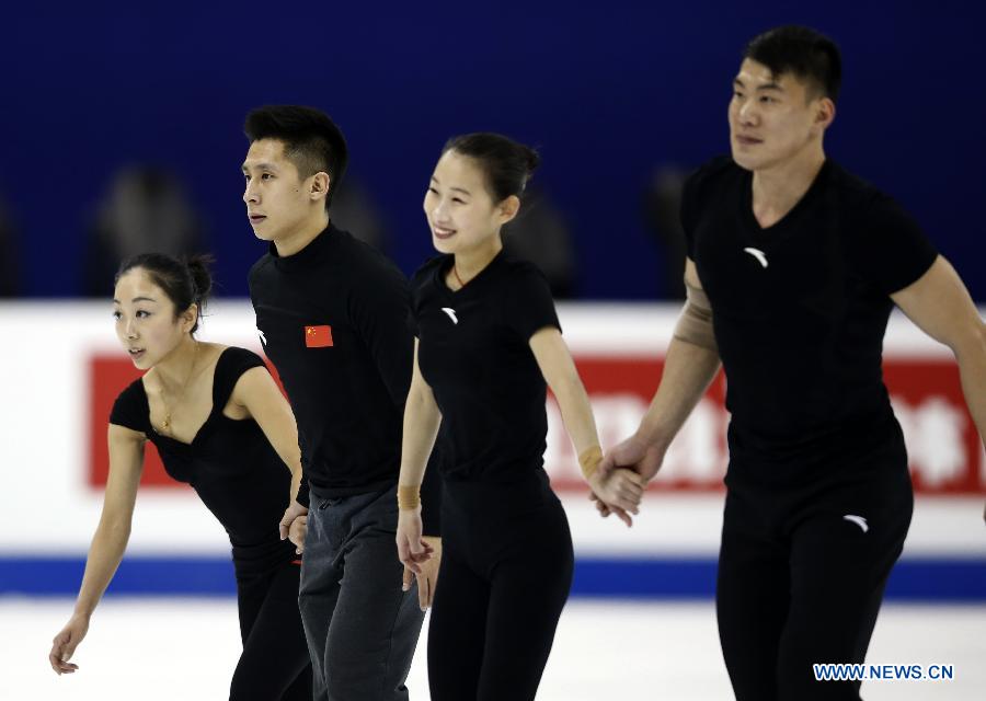 Sui Wenjing, Han Cong and Peng Cheng/Zhang Hao of China take part in their training session before World Figure Skating Championships 2015 at Oriental Sports Center in Shanghai, China on March 24, 2015.(Xinhua/Wang Lili)