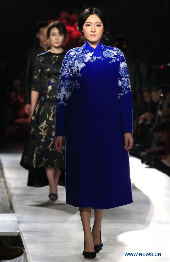 A model presents a creation of Eve de Cina during the China Fashion Week A/W 2015/2016 in Beijing, capital of China, March 24, 2015. (Xinhua/Li Mingfang)