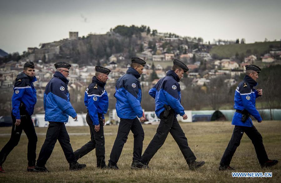 French gendarmes walk in the rescue base camp in the Alps in southern France, March 25, 2015. French gendarmes late Tuesday found one of the two black boxes of the German passenger plane that crashed in southern France with 150 people on board, while a joint international probe into the cause of the accident is under way. (Xinhua/Chen Xiaowei)