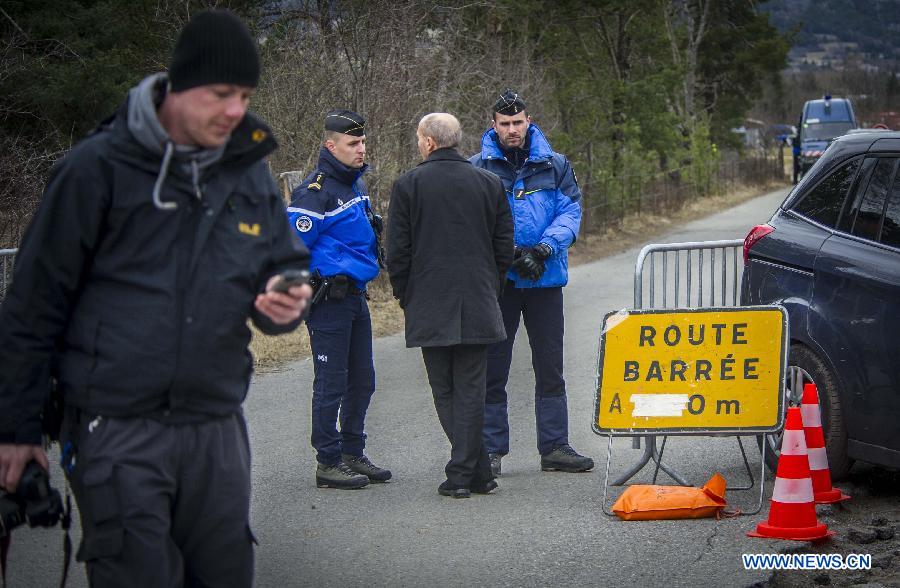 French gendarmes stand guard near the rescue base camp in the Alps in southern France, March 25, 2015. French gendarmes late Tuesday found one of the two black boxes of the German passenger plane that crashed in southern France with 150 people on board, while a joint international probe into the cause of the accident is under way. (Xinhua/Chen Xiaowei)