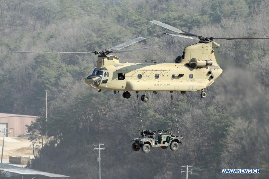 A cargo helicopter flies while it carries a military vehicle during the annual joint military exercise Foal Eagle between South Korea and the United States in Pocheon, northeast of Seoul, March 25, 2015. (Xinhua/Seongbin Kang)