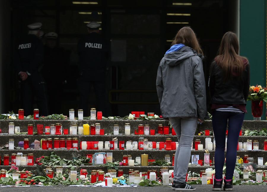 Students mourn in front of their school in Haltern, western Germany, March 25, 2015. Sixteen school children and two teachers were among the 150 victims that died in the Germanwings plane crash in the French alps on the way from Barcelona to Duesseldorf. (Xinhua/Luo Huanhuan)