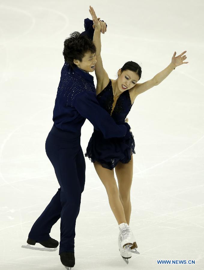 Pang Qing (R) and Tong Jian of China compete during the Pairs Short Program session in ISU World Figure Skating Championships 2015 at Crown Indoor Stadium, Oriental Sports Center in Shanghai, China on March 25, 2015. Pang Qing and Tong Jian took the second place after short program with 72.59 points. (Xinhua/Wang Lili)