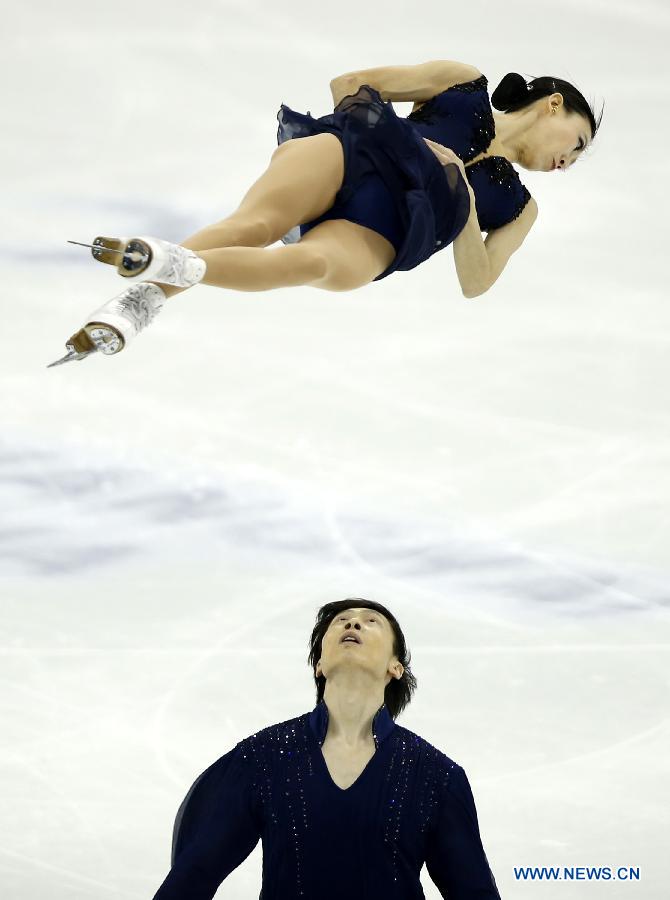 Pang Qing (top) and Tong Jian of China compete during the Pairs Short Program session in ISU World Figure Skating Championships 2015 at Crown Indoor Stadium, Oriental Sports Center in Shanghai, China on March 25, 2015. Pang Qing and Tong Jian took the second place after short program with 72.59 points. (Xinhua/Wang Lili)