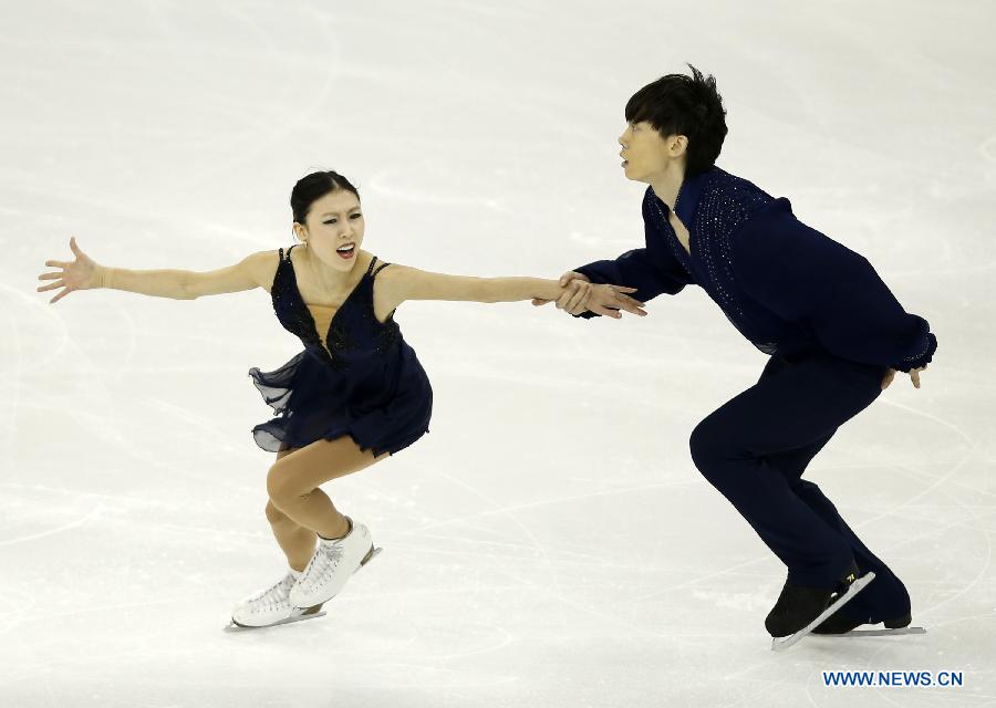Pang Qing (L) and Tong Jian of China compete during the Pairs Short Program session in ISU World Figure Skating Championships 2015 at Crown Indoor Stadium, Oriental Sports Center in Shanghai, China on March 25, 2015. Pang Qing and Tong Jian took the second place after short program with 72.59 points. (Xinhua/Wang Lili)