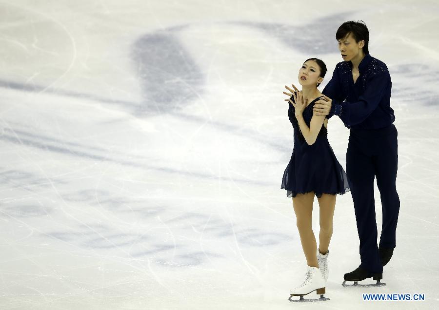 Pang Qing (L) and Tong Jian of China compete during the Pairs Short Program session in ISU World Figure Skating Championships 2015 at Crown Indoor Stadium, Oriental Sports Center in Shanghai, China on March 25, 2015. Pang Qing and Tong Jian took the second place after short program with 72.59 points. (Xinhua/Wang Lili)