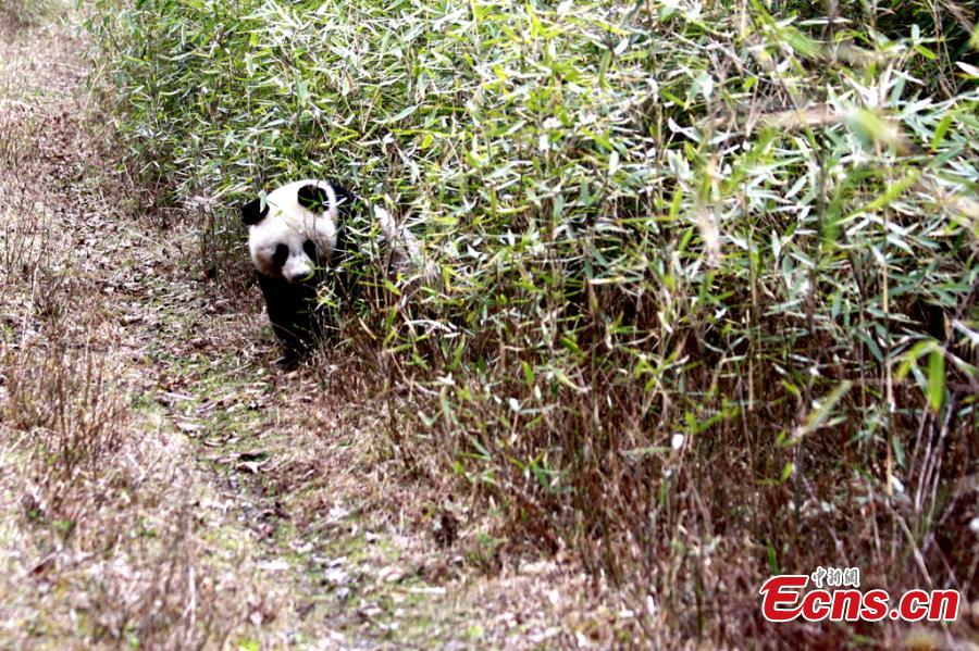 A giant panda eats bamboo at the Changqing Nature Reserve. A report of the fourth panda survey in Shaanxi province, released on March 25, shows that there are about 345 wild giant pandas living in the Qinling Mountains area, an increase of 26.4 percent than the third survey. Most pandas live on the southern slope of the middle section of Qinling Mountains. (Photo provided to China News Service)