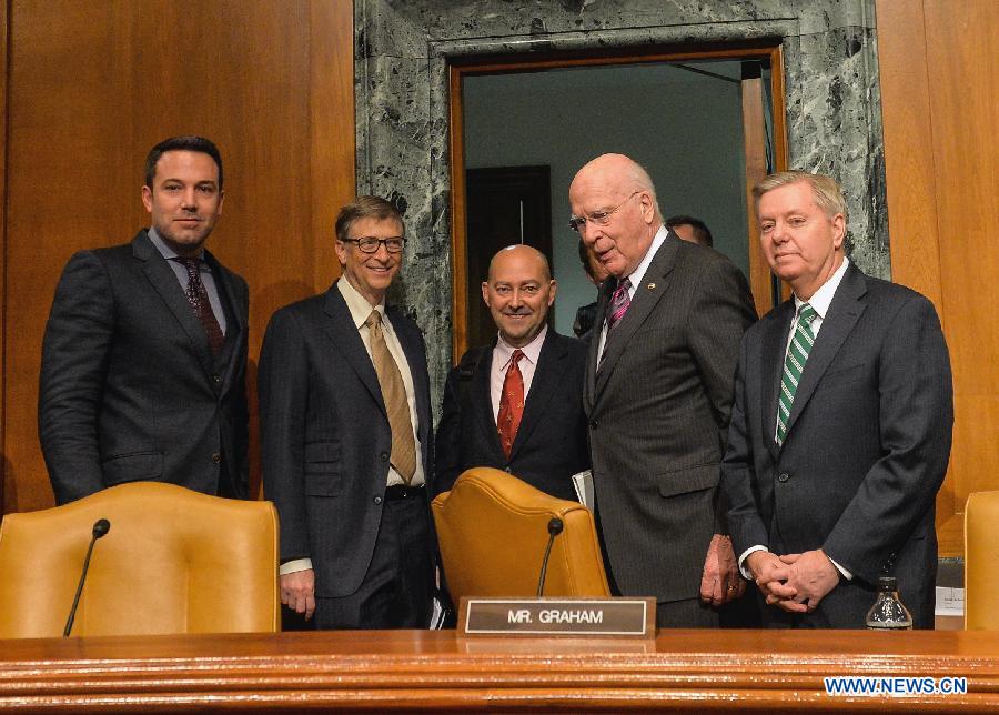 Actor, filmmaker and founder of Eastern Congo Initiative Ben Affleck(1st, L) and Bill & Melinda Gates Foundation Co-Chair Bill Gates(2nd, L) enter the hearing room before a hearing on Diplomacy, Development, and National Security, on Capitol Hill in Washington D.C., capital of the United States, March 26, 2015.(Xinhua/Bao Dandan)