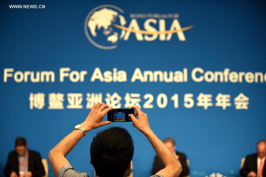 | A guest takes photos with mobile phone at a sub-forum with the theme of "The Other Side of Big Data" during the 2015 Boao Forum for Asia (BFA) in Boao, south China's Hainan Province, March 27, 2015. (Xinhua/Guo Cheng) |