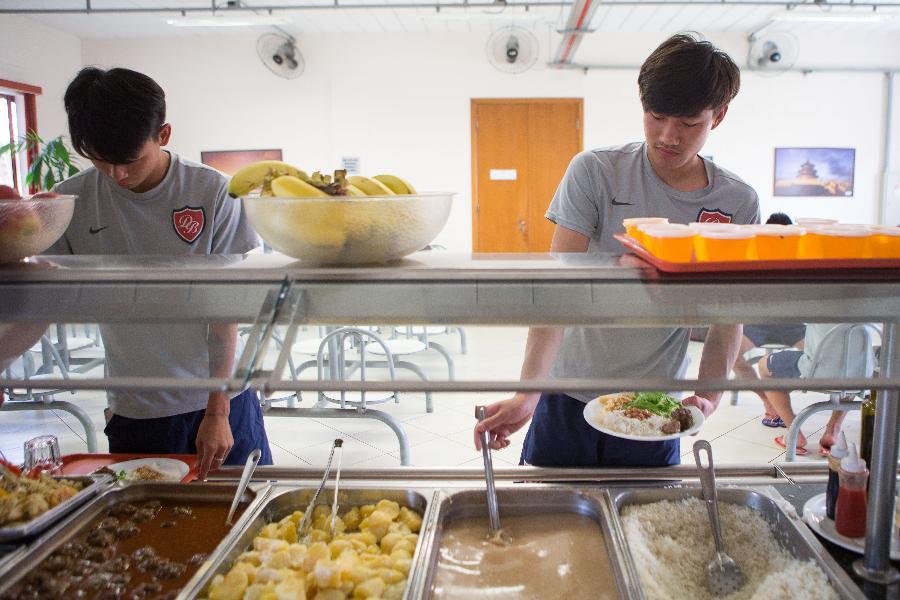 Young player Gao Mingyang (R) takes food in the canteen at Luneng Brazil Sports Center in Porto Feliz, Brazil, March 25, 2015. As a milestone of China's Shandong Luneng Football Club's youth training project, Luneng Brazil Sports Center opend in mid-July of 2014. The 160,000-square-meter sports center, located about 100 kilometers outside Brazil's largest city Sao Paulo, has five standard pitches and two futsal fields. It can accommodate 190 people and includes player apartments, a restaurant, gym, physical therapy room, activity room, meeting room and swimming pool. As the Brazilian base, the Luneng Brazil Sports Center is not only for the youth of Luneng football club, but also for domestic and international club teams and national teams at all levels. The best players aged between 14 and 17 will be selected from Luneng Football School and come to Brazil to learn football techniques and participate in the Brazilian youth league. In order to be rooted in the atmosphere of Brazilian football, Luneng worked out a newly-designed training plan. Chinese players will join the Brazilian players of the same age to train and compete together. They live in the same dormitory, eat in the same canteen, help each others so that they can learn from each others. (Xinhua/Xu Zijian)