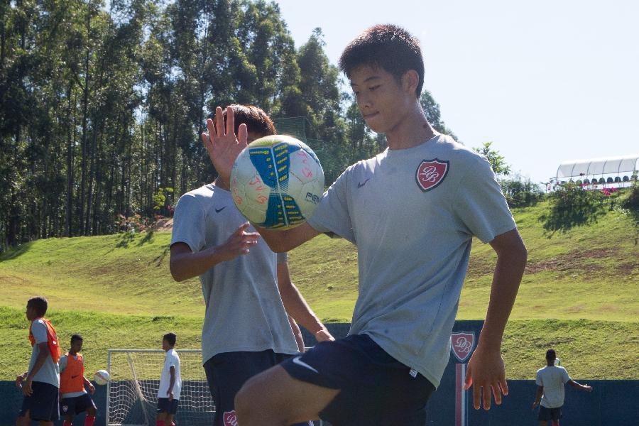 Young player Tian Xin trains at Luneng Brazil Sports Center in Porto Feliz, Brazil, March 25, 2015. As a milestone of China's Shandong Luneng Football Club's youth training project, Luneng Brazil Sports Center opend in mid-July of 2014. The 160,000-square-meter sports center, located about 100 kilometers outside Brazil's largest city Sao Paulo, has five standard pitches and two futsal fields. It can accommodate 190 people and includes player apartments, a restaurant, gym, physical therapy room, activity room, meeting room and swimming pool. As the Brazilian base, the Luneng Brazil Sports Center is not only for the youth of Luneng football club, but also for domestic and international club teams and national teams at all levels. The best players aged between 14 and 17 will be selected from Luneng Football School and come to Brazil to learn football techniques and participate in the Brazilian youth league. In order to be rooted in the atmosphere of Brazilian football, Luneng worked out a newly-designed training plan. Chinese players will join the Brazilian players of the same age to train and compete together. They live in the same dormitory, eat in the same canteen, help each others so that they can learn from each others. (Xinhua/Xu Zijian)