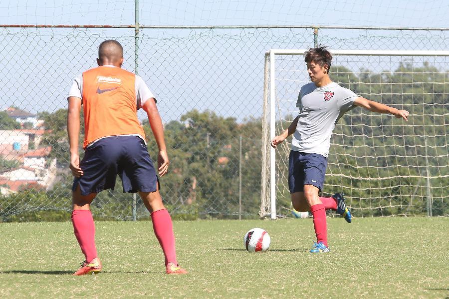 Young player Chen Guoliang (R) trains with a Brazilian young player at Luneng Brazil Sports Center in Porto Feliz, Brazil, March 25, 2015. As a milestone of China's Shandong Luneng Football Club's youth training project, Luneng Brazil Sports Center opend in mid-July of 2014. The 160,000-square-meter sports center, located about 100 kilometers outside Brazil's largest city Sao Paulo, has five standard pitches and two futsal fields. It can accommodate 190 people and includes player apartments, a restaurant, gym, physical therapy room, activity room, meeting room and swimming pool. As the Brazilian base, the Luneng Brazil Sports Center is not only for the youth of Luneng football club, but also for domestic and international club teams and national teams at all levels. The best players aged between 14 and 17 will be selected from Luneng Football School and come to Brazil to learn football techniques and participate in the Brazilian youth league. In order to be rooted in the atmosphere of Brazilian football, Luneng worked out a newly-designed training plan. Chinese players will join the Brazilian players of the same age to train and compete together. They live in the same dormitory, eat in the same canteen, help each others so that they can learn from each others. (Xinhua/Xu Zijian)