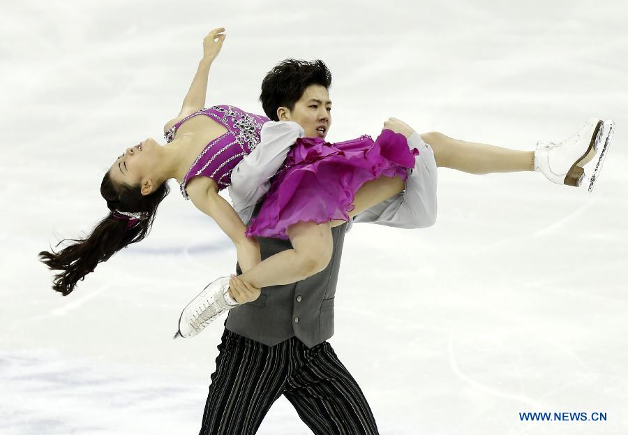 Wang Shiyue (front) and Liu Xinyu of China compete during Ice Dance Free Dancing segment in ISU World Figure Skating Championships 2015 at Crown Indoor Stadium, Oriental Sports Center in Shanghai, China, on March 27, 2015. Wang Shiyue and Liu Xinyu took 128.77 points in total. (Xinhua/Wang Lili)