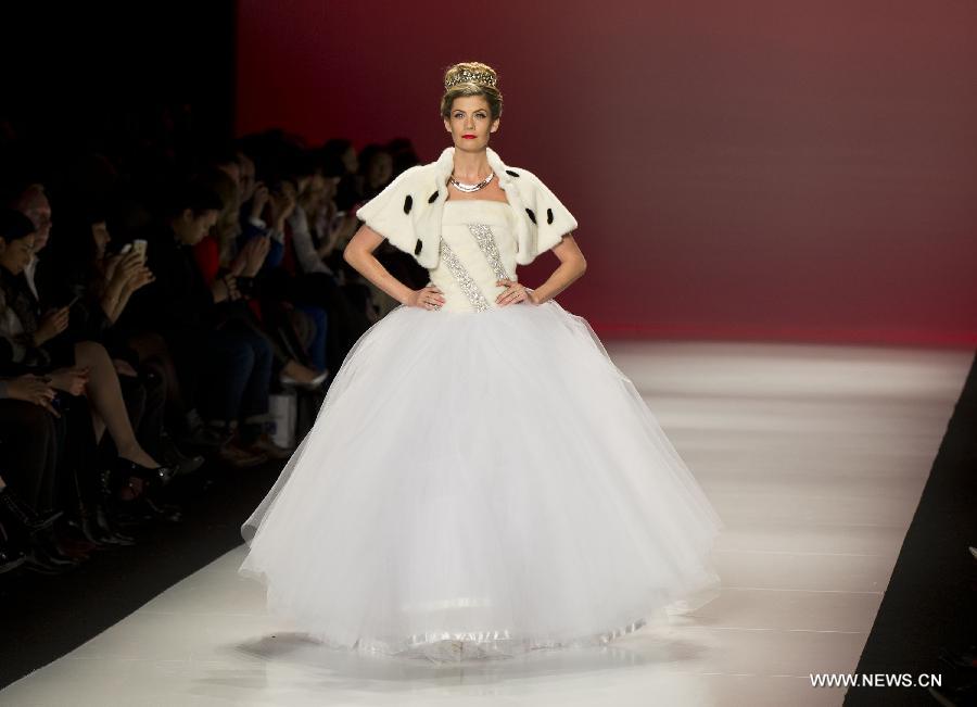 A model presents a creation of Farley Chatto's Czar Nicholas Collection during the World MasterCard Toronto Fashion Week Fall 2015 in Toronto, Canada, March 26, 2015. (Xinhua/Zou Zheng)