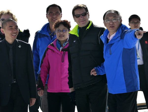 | International Olympic Committee Evaluation Commission Chairman Alexander Zhukov (center) and colleagues, accompanied by Minister of General Administration of Sports Liu Peng (second from right), inspect facilities in Zhangjiakou, Hebei province, on Thursday. FENG YONGBIN/CHINA DAILY |