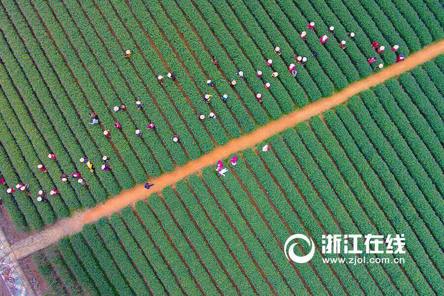 It is the annual season for tea-leaves picking in Meijiawu, Hangzhou. Looking down from above, the boundless green field, golden sunshine, and beautiful tea picking girls in colorful clothes composed an exquisite picture of the spring. (Zhejiang Online/Ni Yanqiang)