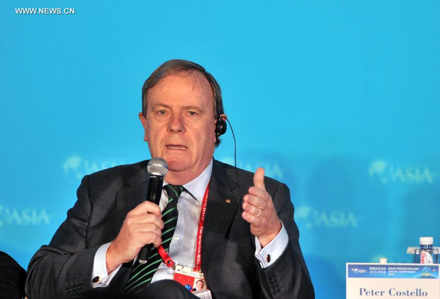 Peter Costello, former Australian Treasurer and Chair of the Board of Guardians of the Australian Future Fund, speaks at a sub-forum with the theme of "Shadow Banking: The Good and Bad" during the 2015 Boao Forum for Asia (BFA) in Boao, south China's Hainan Province, March 28, 2015. (Xinhua/Yang Guanyu)