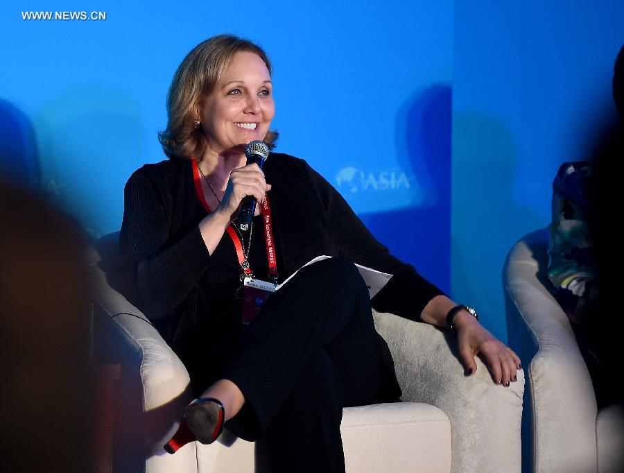 | Josette Sheeran, president and CEO of the Asia Society of the United States, speaks during a sub-forum with the theme of "Asian Infrastructure Investment Bank (AIIB) and the New Development Bank" at the 2015 Boao Forum for Asia (BFA) in Boao, south China's Hainan Province, March 28, 2015. (Xinhua/Guo Cheng) |
