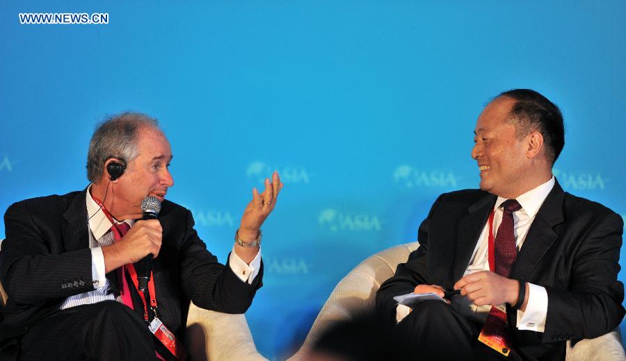 Chairman and CEO of Blackstone Stephen A.Schwarzman (L) talks with CEO of Hony Capital Zhao Linghuan at the sub-forum with the theme of "The Next Financial Crisis" during the 2015 Boao Forum for Asia (BFA) in Boao, south China's Hainan Province, March 28, 2015. (Xinhua/Yang Guanyu)