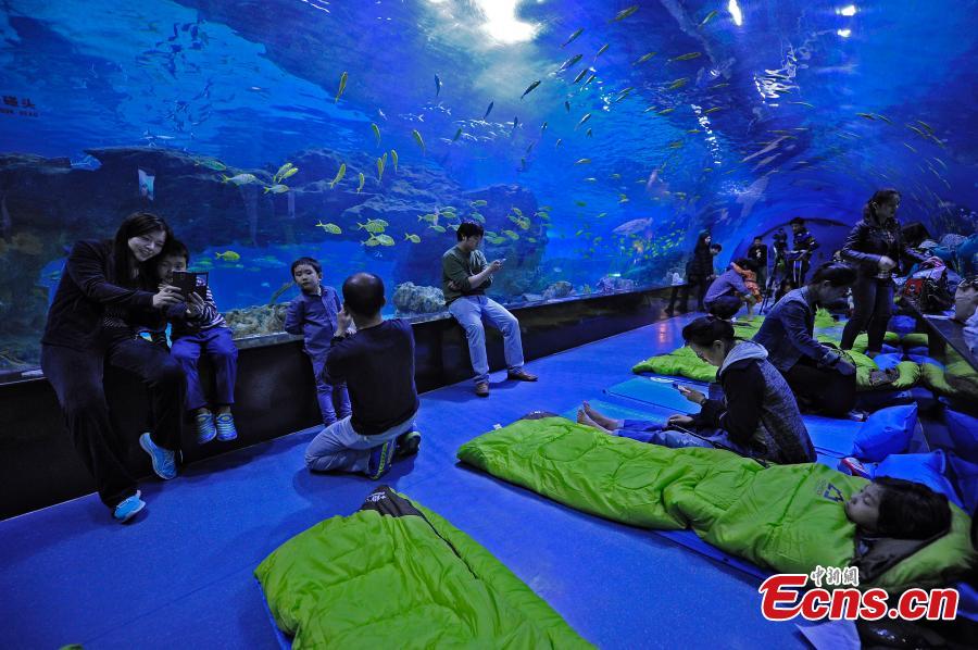 | Visitors look at fish swimming in tank during a sleepover event at an aquarium in Tianjin municipality on March 28, 2015. The aquarium invited visitors to spend a fun-filled night exploring the mysterious creatures of the sea. (Photo/ Tong Yu) |