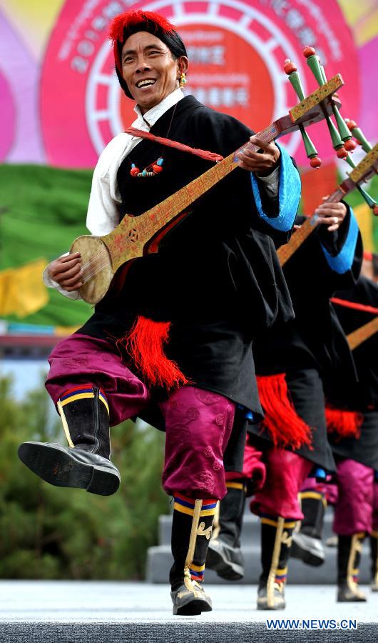 An actor performs Duixie, a traditional local dance prevailed in Tibet, in Gala Village of Nyingchi Prefecture, southwest China's Tibet Autonomous Region, March 30, 2015. The 13th Nyingchi Peach Blossom Cultural Tourism Festival kicked off here on Monday, where a series of activities are held for visitors to enjoy the spring view and local culture. (Xinhua/Liu Dongjun)