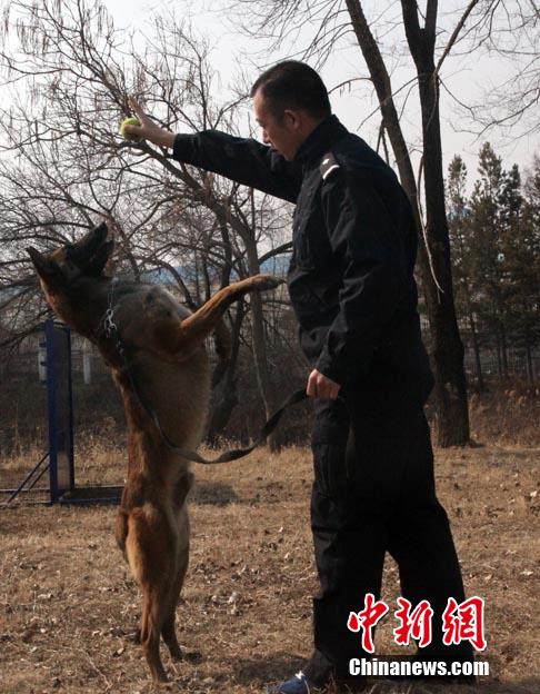 Police dog “Zhuifeng” was brought to Jilin Public Security Bureau when it was just six months old. It is the first police dog of its trainer Song Shijie. The dog has developed a deep affection with Song Shijie as they have spent around two years training together. Song Shijie has been looking after of Zhui Feng like its “mother”. (Chinanews.com/Cang Yan)