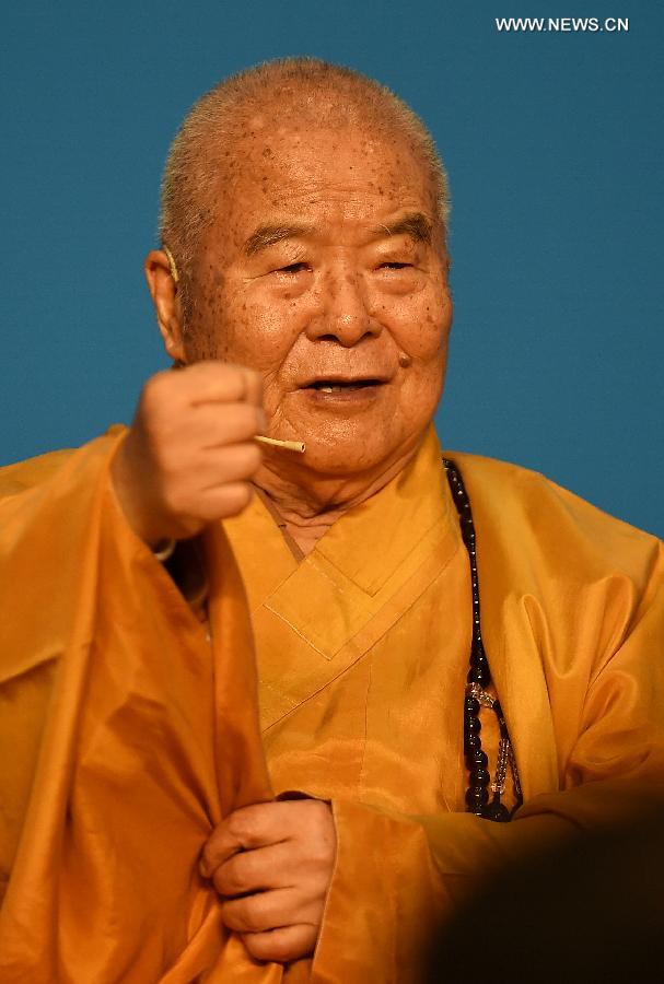Master Hsing Yun, founding President of the World Headquarters of Buddha's Light International Association, speaks during a TV debate session themed on "Peace & Harmony: the Enlightenment of Religions" of the 2015 Boao Forum for Asia (BFA) in Boao, south China's Hainan Province, March 29, 2015. (Xinhua/Guo Cheng)