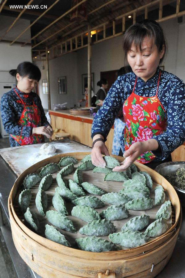 Workers make Qingtuan, or green rice balls, at a pastry shop in Lin'an City, east China's Zhejiang Province, March 29, 2015. Qingtuan, made from glutinous rice mixed with wormwood juice, is a traditional snack popular among people living in the south of Yangtze River during the Qingming Festival (Tomb Sweeping Day). (Xinhua/Hu Jianhuan)