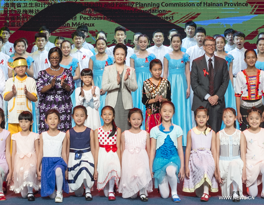 Chinese President Xi Jinping's wife Peng Liyuan (C), who is the World Health Organization (WHO)'s goodwill ambassador for tuberculosis and HIV/AIDS, attends a publicizing activity for the prevention and cure of tuberculosis and HIV/AIDS in Hainan University in Haikou, capital of south China's Hainan Province, March 29, 2015.(Xinhua/Wang Ye)